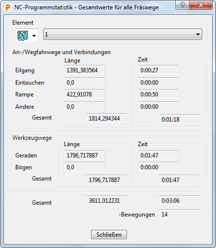 Sie können die Längen- und Zeitwerte für alle An- Wegfahrwege, Verbindungen und Schnittbewegungen sowie die Anzahl der Abhebungen im ausgewählten NC-Programm anzeigen.
