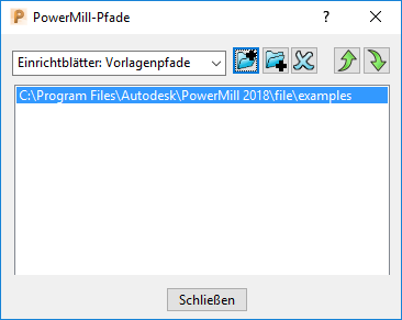 - Wählen Sie im Dialogfeld PowerMill-Pfade in der Liste die Option Einrichtblätter: Vorlagenpfade. Dadurch wird der Pfad zur aktuell ausgewählten Vorlage angezeigt.