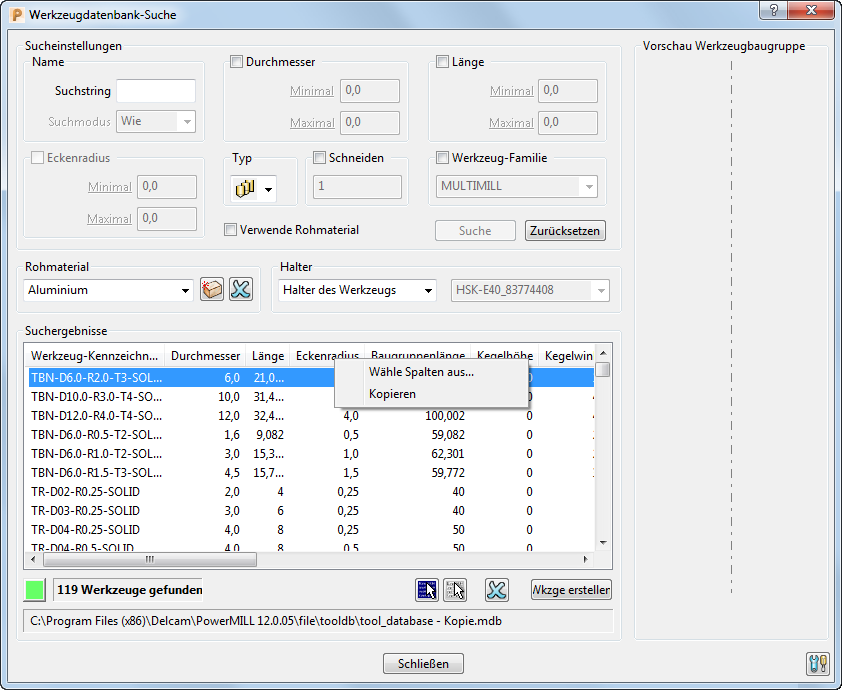 Sie können Werkzeugwege und Werkzeugdaten aus den Dialogfeldern NC-Programm und Werkzeugdatenbank-Suche in den Windows-Zwischenspeicher kopieren. Dies ist hilfreich, wenn Sie Berichte mithilfe anderer Anwendungen erstellen möchten.