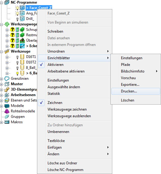 1. Wählen Sie im Kontextmenü des jeweiligen NC-Programms die Option Einrichtblätter > Drucken aus.