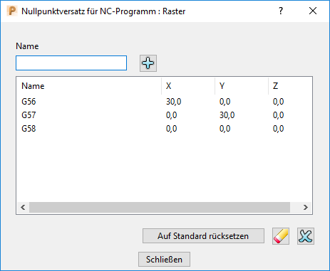 Nullpunktversatz rücksetzen — Klicken Sie, um die Koordinaten des ausgewählten Nullpunktversatzes auf 0,0 zurückzusetzen.