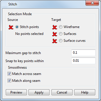 Glattheit - Verwenden Sie diese Optionen, um die Quellfläche mithilfe der Nähte glatt mit der Zielfläche oder -flächenkurve zu verbinden. Bei der Naht handelt es sich um die Stellen, an denen die ausgewählte Kurve der Quellkurve auf das Ziel trifft.