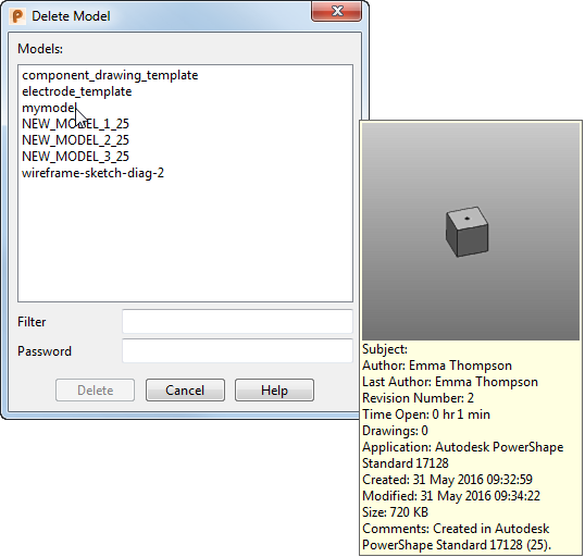 Sie können nicht mehr benötigte Modelle löschen, die in der Datenbank gespeichert sind. Außerhalb der Datenbank gespeicherte Modelle können wie jede andere Datei über den Windows-Explorer gelöscht werden.