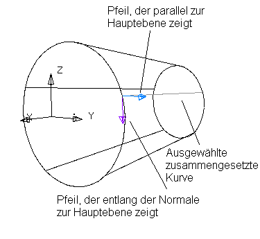 Bedenken Sie die nachfolgende zusammengesetzte Kurve auf einer Oberfläche. Wenn Sie Senkrecht auf Hauptebene (Standardeinstellung) aus den Optionen Winkel messen von ausgewählt haben, sind die Pfeile wie unten stehend ausgerichtet.