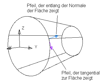 Wenn Sie Tangential zu darunter liegender Fläche ausgewählt haben, sind die Pfeile wie unten stehend ausgerichtet.