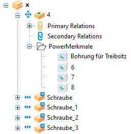 Anmerkung: Sie können auch mit der rechten Maustaste auf die Komponente im Grafikfenster klicken und PowerMerkmale > Erstellen/Löschen im Kontextmenü wählen. Dadurch werden PowerMerkmale in den ausgewählten Zielkomponenten statt in der gesamten Baugruppe erstellt oder gelöscht. Das Dialogfeld PowerMerkmale löschen wird nur dann angezeigt, wenn die Option Dialog PowerMerkmale erzeugen öffnen unter Datei > Optionen > Anwendungsoptionen > Baugruppe > Dialogfeld Allgemein ausgewählt ist. Wenn diese Option abgewählt ist, wird die Komponentenauswahl gefiltert, um die Ziel- und Quellkomponenten anzugeben. Das Dialogfeld wird jedoch angezeigt, wenn eine ausgewählte Komponente Quelle oder Ziel ein kann.