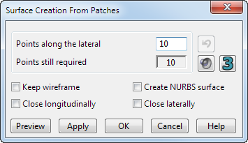 Sie können eine Fläche aus Flächenstücken, den Bereichen zwischen lateralen und longitudinalen Kurven, erstellen. Verwenden Sie diese Option, um Punkte, die die Verschneidungen von Lateralen und Longitudinalen darstellen, zum Definieren von Flächenstücken einzugeben. Diese Flächenfelder werden dann dazu verwendet, eine Oberfläche zu definieren und zu erstellen.