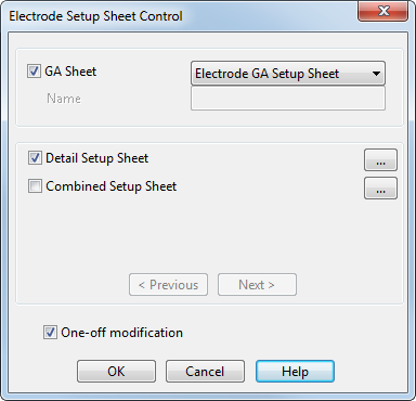 Anmerkung: Wenn Sie das Dialogfeld von Elektrode ändern aus öffnen, führt das Ändern des Gesamtbaugruppen-Einrichtblatts dazu, dass der Elektrodenmaßtext von einem Gesamtbaugruppen-Einrichtblatt zu einem anderen verschoben wird.