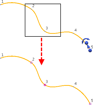 Halten Sie die UMSCHALTTASTE gedrückt, und wählen Sie mithilfe des Auswahlrahmens einen beliebigen Teil der Kurve oder PowerSurface aus, um alle Punkte innerhalb des Rahmens zur Auswahl hinzuzufügen.