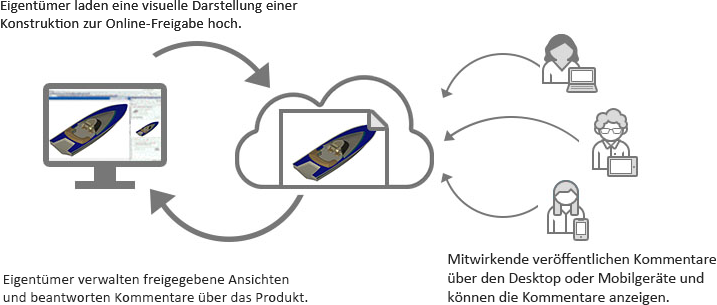Verwenden Sie freigegebene Ansichten für die Online-Zusammenarbeit an einer visuellen Darstellung Ihres Modells oder Ihrer Konstruktion. Erstellen Sie beispielsweise eine freigegebene Ansicht für einen Kunden, um eine Genehmigung einzuholen oder um Ihrem Vertriebsteam einfachen Zugriff zu bieten, damit vor Ort eine Präsentation erfolgen kann. Unter Verwendung der von Ihnen bereitgestellten Verknüpfung kann jeder Anwender die freigegebene Ansicht anzeigen und kommentieren, ohne selbst über ein installiertes Autodesk-Produkt zu verfügen. Wenn ein Anwender einen Kommentar in der freigegebenen Ansicht verfasst, werden Sie per E-Mail darüber benachrichtigt. Aus Ihrem Autodesk-Produkt heraus können Sie Kommentare anzeigen und darauf antworten sowie Ihre freigegebene Ansicht verwalten.