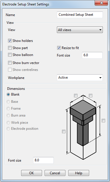 Anmerkung: Die Vorgabevorlage für die Elektrodeneinrichteblätter wird automatisch aktualisiert, wenn Sie Ihre Version von PowerShape aktualisieren. Wenn Sie jedoch das Einrichtblatt vorher individuell eingerichtet haben, überschreibt eine neu installierte Version von PowerShape diese individuelle Version nicht.