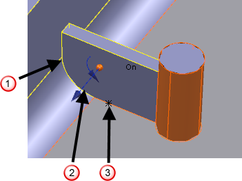 4. Klicken Sie auf drei Punkte, um einen Bogen zu definieren. Wählen Sie beispielsweise , und aus. Die Rotationsachse wird am Mittelpunkt des Bogens erstellt: