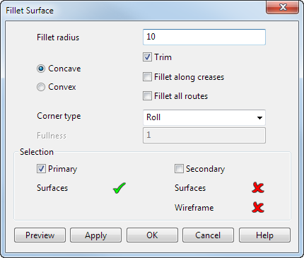 3. Verwenden Sie das Dialogfeld Verrundungsfläche, um Eingangsdaten zur Verfügung zu stellen, mit denen eine Verrundungsfläche erstellt werden kann:
