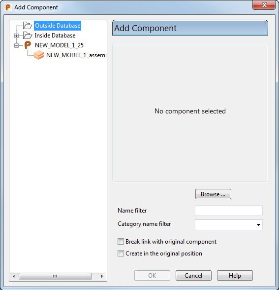 - Verknüpfung zur Originalkomponente auflösen - Verwenden Sie diese Option, um die Verbindung mit der originalen Komponentendefinition zu erhalten oder aufzulösen, wenn Sie eine Komponente aus der Komponentenbibliothek oder einem anderen Modell hinzufügen.