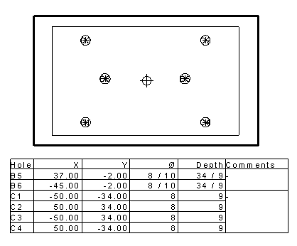 Die Liste zeigt die Beschriftungen, Mittelpunkte, Durchmesser und Tiefen der Bohrungen an. Handelt es sich um eine konische Bohrung, werden zwei Durchmesser angegeben.