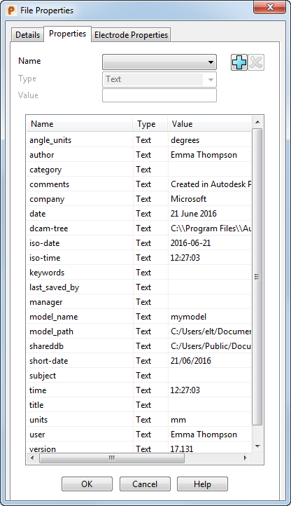 Auf der Eigenschaften-Registerkarte im Dialogfeld Datei-Eigenschaften werden Informationen zum Modell erfasst und angezeigt.