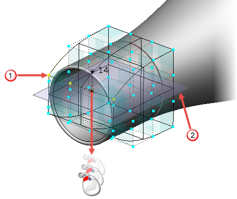 Verwenden Sie diese Option, um ein Volumenmodell, eine Oberfläche oder ein Netzmodell mithilfe eines instrumentierten Rahmens zu morphen. Punkte, Linien und Ebenen des Rahmens werden gezogen, um ausgewählte Bereiche des Modells dynamisch zu morphen.