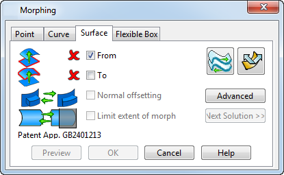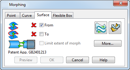 Verwenden Sie die Fläche-Registerkarte im Dialogfeld Morphen, um die Kurve auszuwählen und den Morph zu bestimmen: