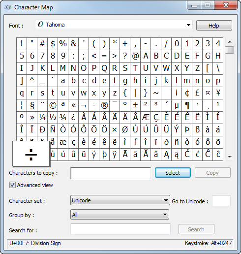 In der unteren rechten Ecke des Dialogfelds Zeichentabelle wird der Zeichenwert (Tastaturanschlag) angezeigt, in diesem Beispiel ALT + 0247.