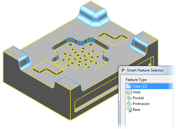 Das Dialogfeld Smart Feature-Auswahl ähnelt dem Dialogfeld Smart Feature-Erkennung. Der Unterschied besteht darin, dass Sie hier Merkmale in einem Volumenmodell mit einer Historie erkennen und auswählen können.
