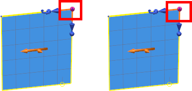 In diesen Beispielen wurden beide Eckpunkte auf den Oberflächen gezogen, damit sich ihre Form von einer Standardebene ändert. Für das rechte Bild wurde die Taste N verwendet, um die Oberfläche in senkrechter Richtung zur Flächennormalen zu verschieben.