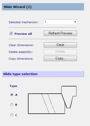 Ausgewählter Mechanismus – Zeigt an, an welchem Schieberkern Sie gerade arbeiten. Diese Liste enthält alle erforderlichen Schieberkerne für das Erstellen von Schiebern. Toolmaker erkennt anhand der Namen, ob Schieberkerne in der Form vorhanden sind.
