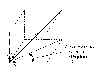 Scheinwinkel - Der Scheinwinkel wird zwischen der Projektion des Vektors auf einer Ebene und der ausgewählten Achse gemessen. Wenn es sich um die X-Achse handelt, ist die XY-Ebene relevant. Für die Y-Achse ist die YZ-Ebene und für die Z-Achse ist die ZX-Ebene relevant. Ein Beispiel für den Scheinwinkel der X-Achse ist unten abgebildet.