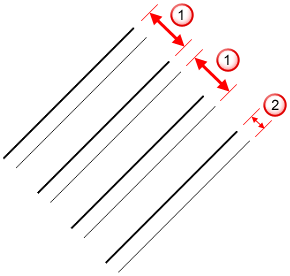 Abstand 2 – Wenn Sie zwei Linienarten verwenden, definiert Abstand 1 den Abstand zwischen Linien derselben Art. Abstand 2 definiert den Versatz der Linie mit Linienart 1 von jener mit Linienart 2. In diesem Beispiel werden zwei Linienarten verwendet: eine feine Linie und eine dickere Linie: