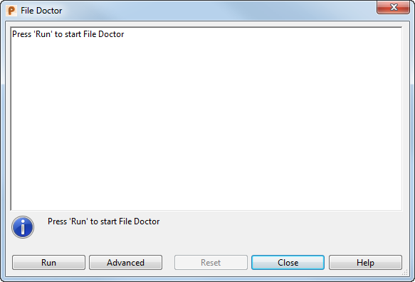 - Erweitert – Wechselt zu der erweiterten Version des Dateidoktors und zeigt das Dialogfeld Dateidoktor (erweiterter Zustand) an. Dieser Modus gewährt Ihnen die volle Kontrolle über die Überprüfungsvorgänge und Fehlerbehebungen, die vom Dateidoktor ausgeführt werden. Diese Option sollte ausschließlich von erfahrenen Benutzern verwendet werden.
