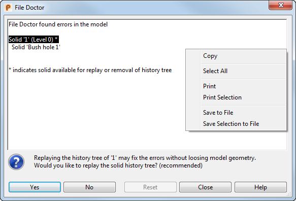 - Zurücksetzen – Lädt das Modell erneut, das vor der Reparatur mit dem Dateidoktor gespeichert wurde. Diese Option steht nur dann zur Verfügung, wenn das Modell vor der Reparatur gespeichert wurde.