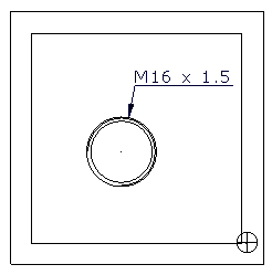 - Für die metrische ISO-Norm wird Gewindebezeichnung/Nenndurchmesser/Neigung/optionale Toleranz verwendet. Das folgende Beispiel enthält eine 16 mm IMF-Bohrung. Diese wird als M16 x 1,5 bemaßt, wobei die Abmessung den Durchmesser der Bohrung und die Steigung der Gewinde angibt: