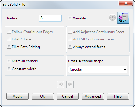 - Eine Volumenverrundung mit konstantem Radius in eine mit variablem Radius umwandeln. Wählen Sie die Option Erweitert, um das Formular Verrundung mit variablem Radius zu öffnen. Alternativ wählen Sie die Option Variabel und geben Sie neue Radiuswerte entlang der Verrundung ein.