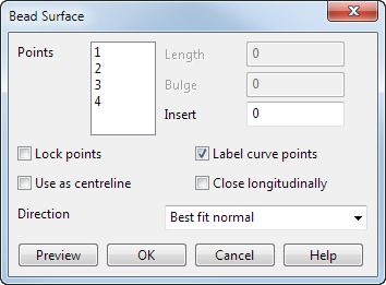 Vorschau - Dies zeigt die Fläche unter Verwendung der gegebenen Parameter an. Wenn die resultierende Oberfläche nicht korrekt ist, ändern Sie die Parameter, und klicken Sie erneut auf Vorschau. Die Ziehgriffe an Punkt 1 können verwendet werden, um die Richtung der Sicke umzukehren.
