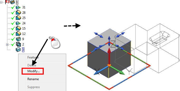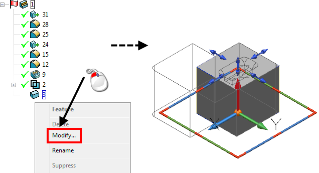 - Merkmale in umgeformter Position ändern - Wählen Sie diese Option aus, um ein Merkmal in ungeformter Position zu bearbeiten. Wenn Sie zum Beispiel einen Booleschen Quader verschoben haben, wird der Quader in seiner aktuellen Position bearbeitet.