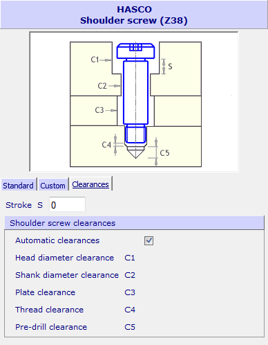 Auf der Freimachungen-Registerkarte werden die Parameter angezeigt, die für Komponenten wie Führungssäulen, Auswerferstifte, Schrauben, Angussbuchsen, Stützsäulen und Passungen erforderlich sind. Die angezeigten Parameter sind für die Art der Komponente, die Sie erstellen, spezifisch.