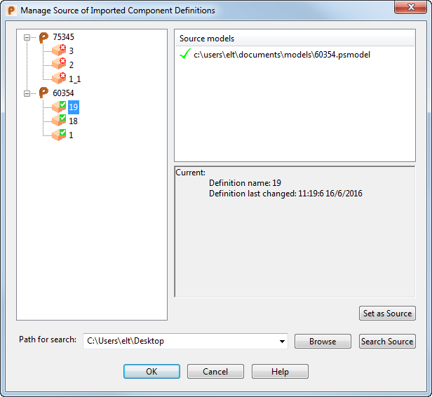 Quellmodell – Im Baum wird die Liste der Quellmodelle zusammen mit den zugehörigen importierten Komponentendefinitionen angezeigt. Die Symbole auf der linken Seite stehen für die importierte Definition, und die auf der rechten Seite für die Definition im Quellmodell. Wenn die Verknüpfung zwischen diesen unterbrochen ist (wenn beispielsweise die Komponentendefinition im Quellmodell umbenannt oder gelöscht wurde), wird das Symbol geändert und weist auf das Problem hin .