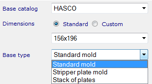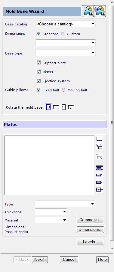 Wenn Sie den Gesenk-/Kern-Assistenten eingesetzt haben, werden die korrekten Werte für Typ, Dicke und Material für die Gesenk- und Kernplatten automatisch eingegeben. Sie können diese Werte für eingesetzte und leere Taschen-Modi ändern.