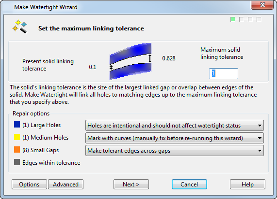 Erweitert – Klicken Sie auf diese Schaltfläche, um zur Seite Repariere Lücken im Volumenmodell zu gelangen, auf der Sie bestimmte Werte in den Optionen zum Füllen von Löchern angeben können.