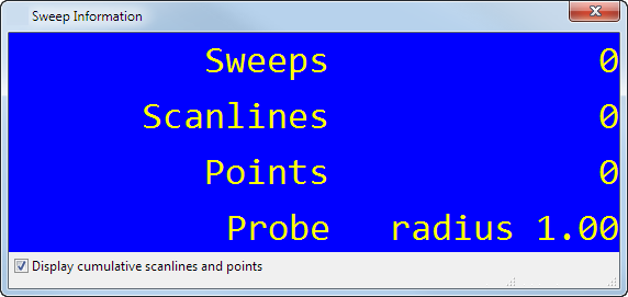 Der Dialog Durchlauf-Information zeigt die Anzahl der Durchläufe, Scanlinien und Punkte an, die Sie in der aktuellen Sitzung erfasst haben. Außerdem zeigt der Dialog an, welcher Gerätetyo verbunden ist: