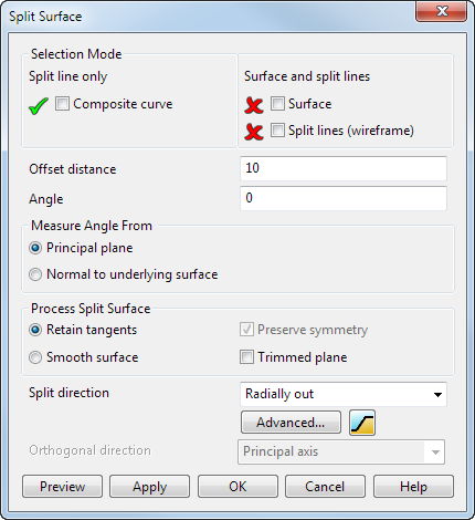 Vorschau - Zeigt die Trennfläche an, die mithilfe der aktuellen Einstellungen in dem Dialog erstellt wird. Sie können die Einstellungen im Dialog weiterhin ändern, bis Sie mit der in der Vorschau angezeigten Trennfläche zufrieden sind.