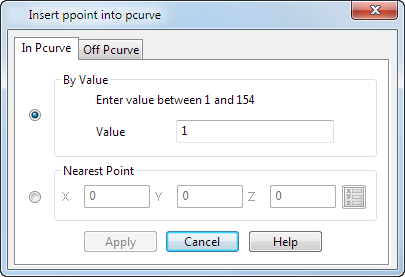 - Durch Wertangabe - Dies fügt den P-Punkt an einem bestimmten, parametrischen Wert ein. Geben Sie den parametrischen Wert ein, der bestimmt, wo der neue P-Punkt auf der P-Kurve liegen soll.