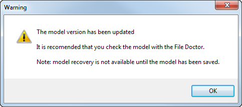 - Wenn die Option Bei Modellaktualisierung interaktiv den Dateidoktor starten ausgewählt ist (Standard) und die Modellversion aktualisiert wurde, wird der Dateidoktor interaktiv ausgeführt. Der folgende Warnmeldungsdialog wird angezeigt: