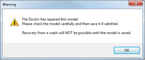 - Wenn die Option Bei Modellaktualisierung interaktiv den Dateidoktor starten ausgewählt ist und die Modellversion aktualisiert wurde, wird der Dateidoktor interaktiv ausgeführt. Der folgende Warnmeldungsdialog wird angezeigt: