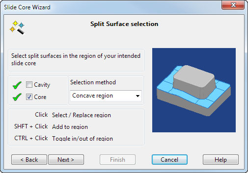 Verwenden Sie diese Seite, um die Trennfläche auf dem Formeinsatz für die Kern- und Formhalteplatten auszuwählen.
