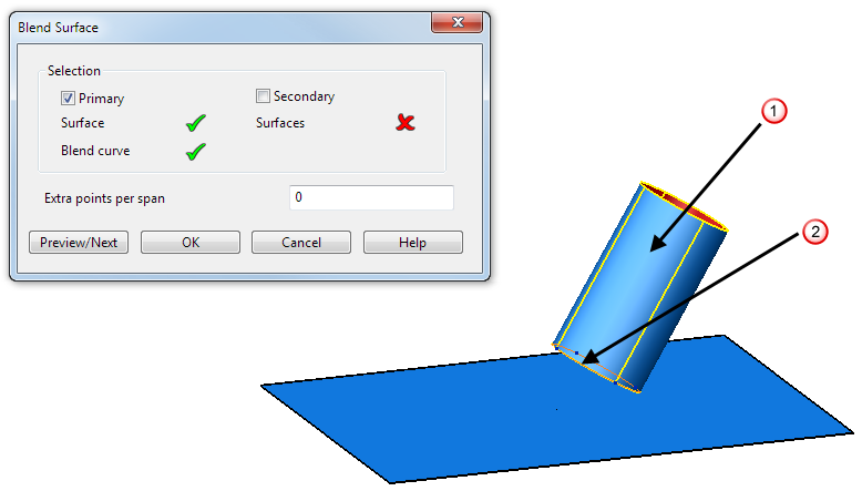 - Primärauswahl – Dies wird verwendet, um die Ausgangsfläche für den Übergang sowie eine der Kurven auszuwählen, auf der die Übergangsfläche beginnt. Wählen Sie die Fläche, auf der der Übergang beginnen soll