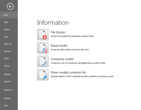 - Info – Zeigt Optionen an, um auf das Dialogfeld Dateidoktor und Datei-Eigenschaften zuzugreifen und das Modell zurückzusetzen oder zu komprimieren.