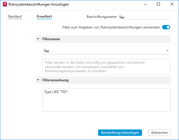 Ermöglicht die Auswahl vorhandener Filter, die neuen Rohrleitungsbeschriftungen hinzugefügt werden sollen. Filter werden in der Datei