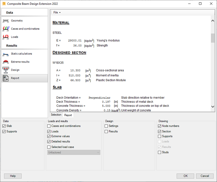 To view a report, select the Report tab in the graphic viewer. You can select the following data and results to be displayed in a calculation note: