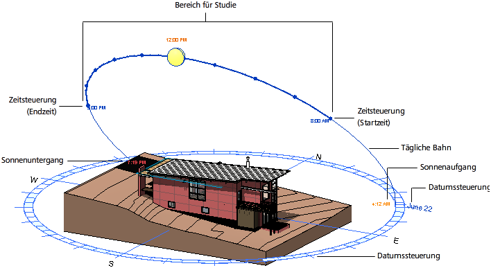 Um das Potenzial der Sonnenstudien voll auszuschöpfen, zeigen Sie die Sonnenbahn an und verwenden Sie dann deren Kontextmenü, um das Dialogfeld Sonneneinstellungen anzuzeigen, wann immer Sie es benötigen. Indem Sie die Sonnenbahn und das Dialogfeld Sonneneinstellungen zusammen verwenden, können Sie die Vorteile beider miteinander kombinieren: die stark visuellen, interaktiven Steuerelemente der Sonnenbahn und die Voreinstellungen und gemeinsam genutzten Einstellungen des Dialogfelds.