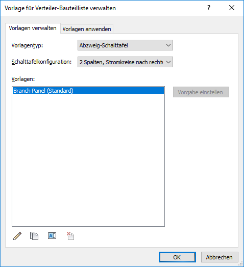 Verwenden Sie das Dialogfeld Vorlage für Verteiler-Bauteilliste verwalten, um Vorlagen für Verteiler-Bauteillisten zu bearbeiten, duplizieren, löschen und anzuwenden. Sie können auch die Standardvorlage festlegen.